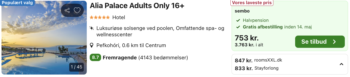 Husk at vælge hotellet med halvpension inkluderet. Rejs365 er ikke et rejsebureau, men en rejseside der finder gode tilbud! – Vi modtager kommission, men det påvirker ikke din pris! Læs mere her |