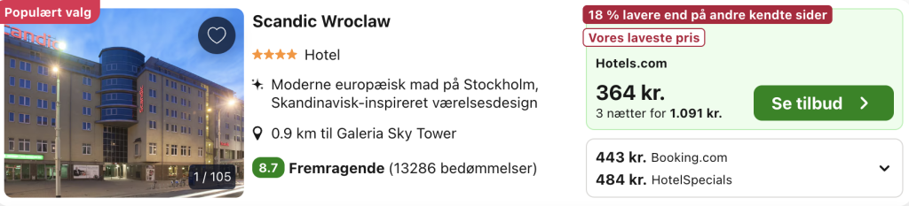 Scandic Wroclaw ligger centralt i Wrocław, lige over for byens hovedbanegård og i kort afstand til den historiske gamle bydel. Hotellet har en moderne og nordisk inspireret indretning med lyse, rummelige værelser, komfortable senge og et roligt udtryk, der passer godt til både forretningsrejsende og feriegæster. Atmosfæren er afslappet og funktionel, og hotellet er kendt for sin høje komfort og gode service.