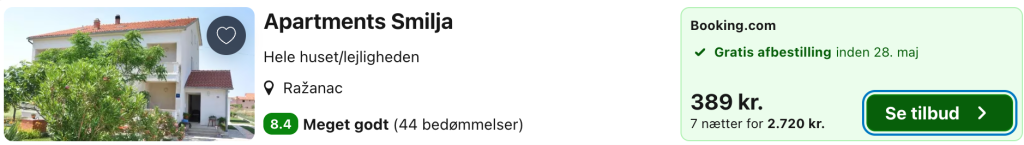 Apartments Smilja ligger i den lille kystby Razanac nord for Zadar og byder på en afslappet ferieatmosfære tæt på Adriaterhavets klare vand. Her bor man i rolige omgivelser med nem adgang til både strand og byens få, lokale faciliteter, hvilket gør det let at nyde ferien i et behageligt tempo. Lejlighederne er enkelt og funktionelt indrettet og egner sig godt til ophold, hvor fokus er på frihed, privatliv og muligheden for selv at tilrettelægge dagene. Fra området er der kort afstand til smukke kyststrækninger, små badebugter og udflugter til både Zadar og det omkringliggende norddalmatinske landskab.