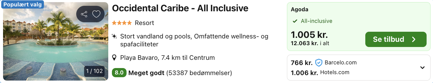 Med sin fantastiske beliggenhed ved Bavaro Beach, en af de smukkeste strande i den Dominikanske Republik, og sine luksuriøse faciliteter, er Occidental Caribe det perfekte valg for dem, der ønsker en all-inclusive ferie med adgang til både afslapning og eventyr. Uanset om du er til afslappende solbadning, vandsport eller kulturelle oplevelser, vil Occidental Caribe sørge for, at din ferie bliver både behagelig og uforglemmelig.