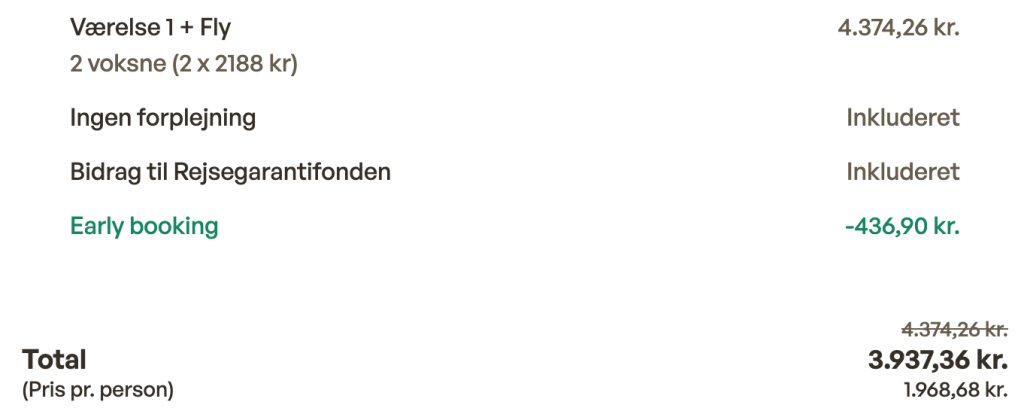 Prisen tager udgangspunkt i 2 personer. Man kan sagtens rejse flere voksne og eller med børn og derved typisk opnå en billigere pris pr. person.
