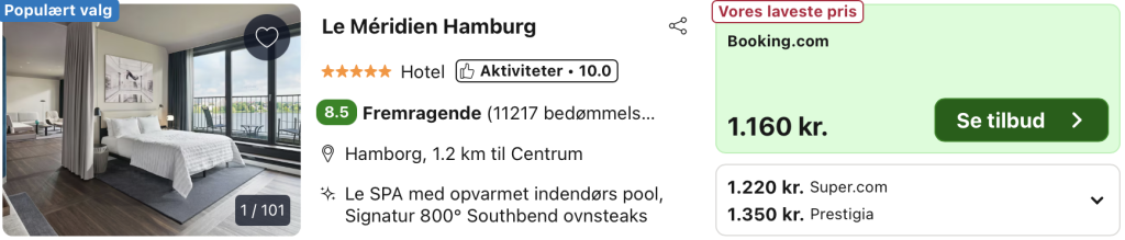 Vi har taget udgangspunkt i et ophold fra den 21. – 22. februar på Designhotellet Le Méridien Hamburg, der ligger midt i byen med en fantastisk udsigt til søen Außenalster. Du kan spise på Heritage Restaurant and Bar på 9. sal og frit benytte helseklubben med fitnesscenter og pool. Hotellet har også gratis wi-fi overalt.