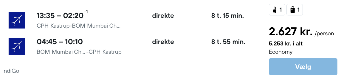På vores flysøgningsmaskine har vi fundet billige flybilletter fra København til Mumbai: