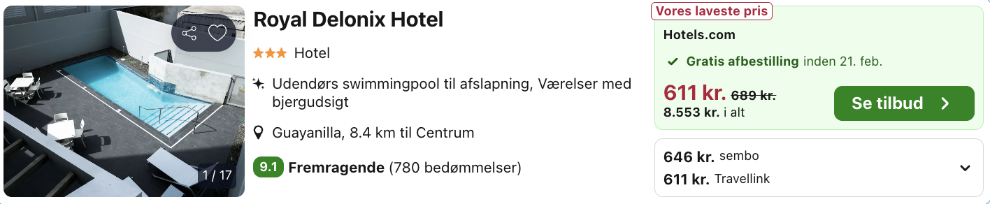 Hvis rejsen er med “Vis fly” og “Vis hotel” link, så er der tale om en sammensat rejse. Det vil sige at fly og hotel skal bestilles hver for sig. Prisen vi angiver vil dog være samlet for fly og hotel med mindre andet er angivet.