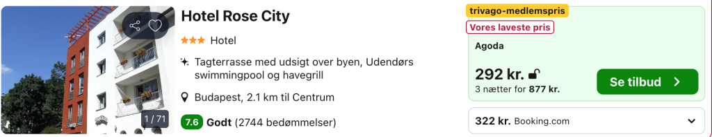 | Bemærk: Husk at lade søgningen på fly og hotel blive helt færdig. Der kan være mindre prisforskelle på mobil og pc. Vælg “Vores laveste pris” på trivago, for at opnå den bedste pris på hotellet.