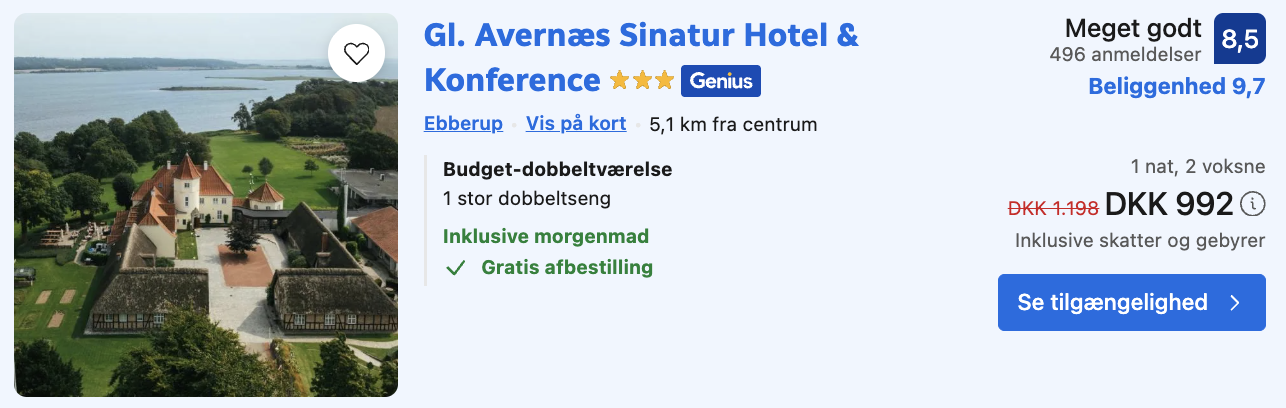 Bemærk: Den samlede pris for opholdet er 992,- for 2 personer i et dobbeltværelse, hvilket svarer til 496,- per person.