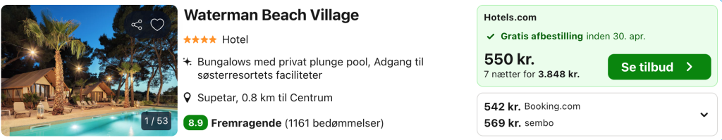 Hvis rejsen er med “Vis fly” og “Vis hotel” link, så er der tale om en sammensat rejse. Det vil sige at fly og hotel skal bestilles hver for sig. Prisen vi angiver vil dog være samlet for fly og hotel med mindre andet er angivet.