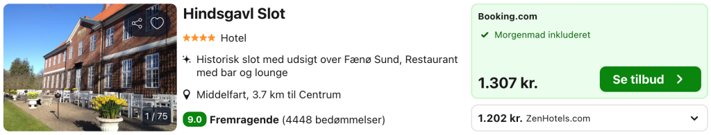 Bemærk: Den samlede pris for opholdet er 1.202,- for 2 personer i et dobbeltværelse, hvilket svarer til 601,- per person. Der kan være mindre prisforskelle på mobil og pc. Undersøg med fordel, hvor det er billigst inden bestilling. Tryk på “Hindsgavl Slot”. Vælg Hotels.com for at opnå den bedste pris. Rejs365 er ikke et rejsebureau, men en rejseside, der finder gode tilbud! – Vi modtager kommission, men det påvirker ikke din pris! Læs mere her |