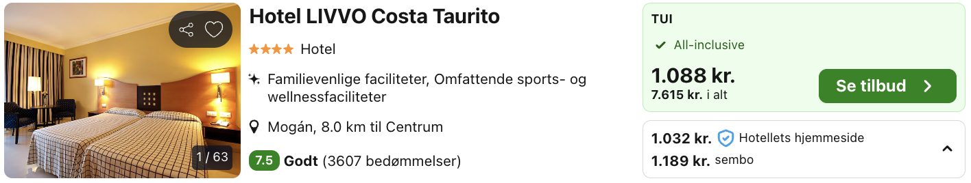 | Bemærk: Hotellet koster 7.222,- for to personer i et dobbeltværelse, hvilket svarer til 3.611,- per person. |