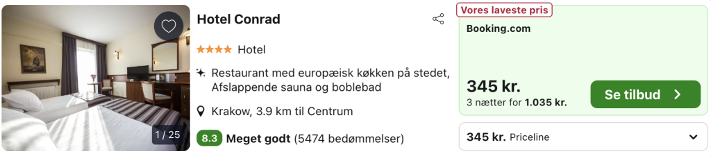 | Bemærk: Den samlede pris for hotellet er 1.035,- for 2 personer, hvilket svarer til 518,- per person. |