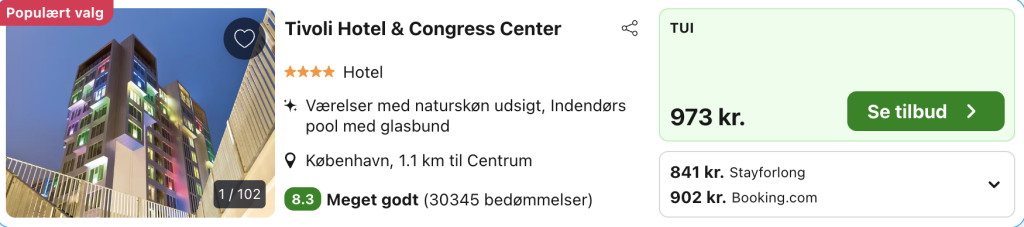 Tivoli Hotel København ligger centralt i hovedstaden, tæt på Københavns Hovedbanegård, havnefronten og byens mange seværdigheder. Hotellet er moderne og stilfuldt indrettet med inspiration fra Tivolis eventyrlige univers, hvilket skaber en farverig og samtidig elegant atmosfære. Værelserne er rummelige og komfortable med store vinduer, gode senge og moderne faciliteter, og mange har flot udsigt over byen eller havnen.