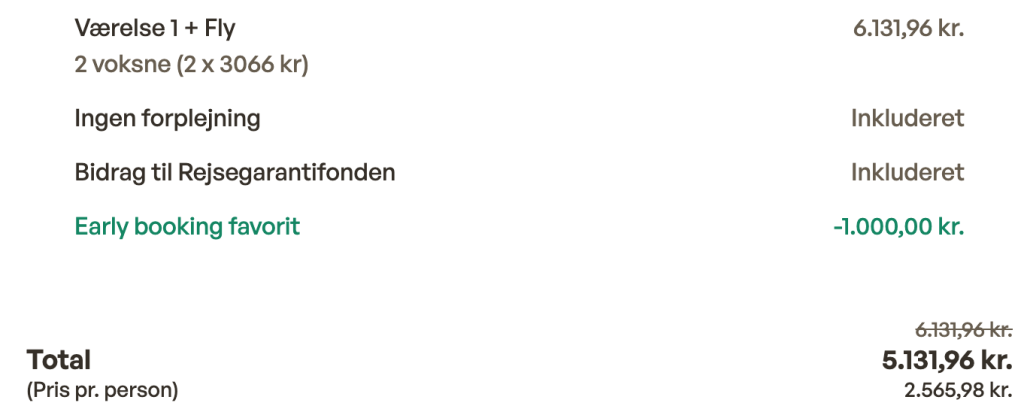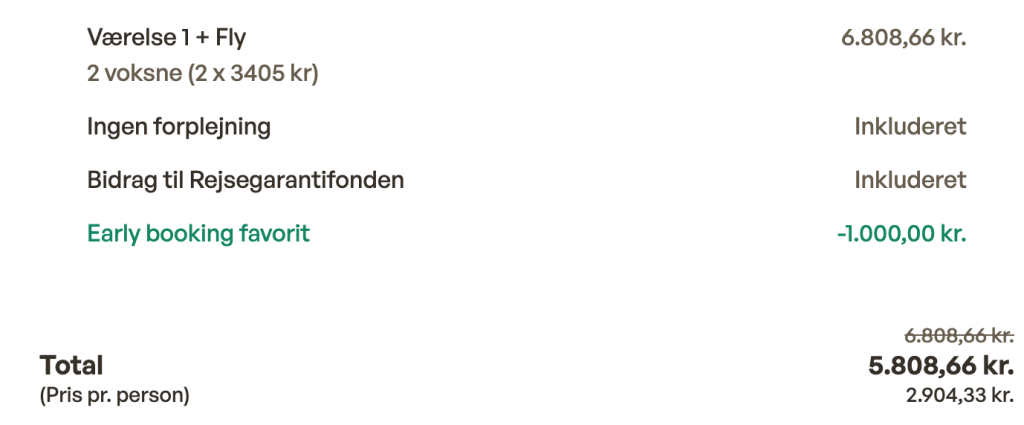 Prisen tager udgangspunkt i 2 personer. Man kan sagtens rejse flere voksne og eller med børn og derved typisk opnå en billigere pris pr. person.