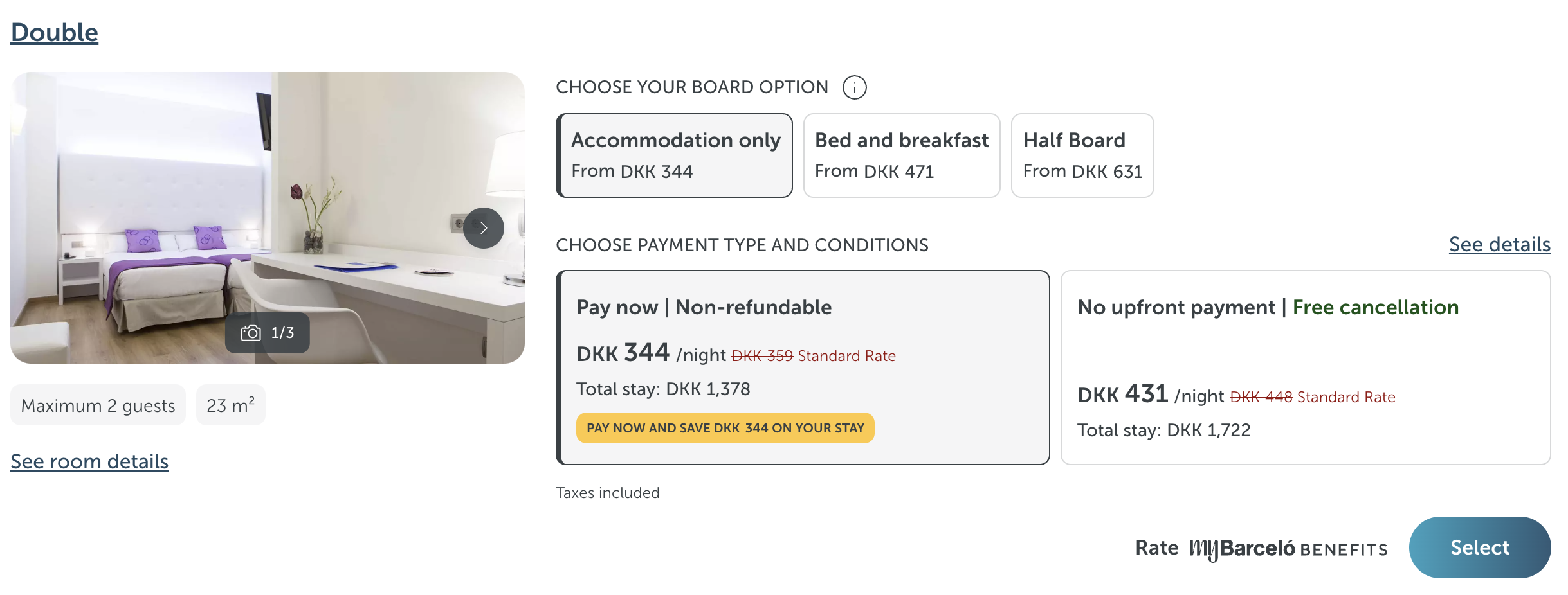 | Bemærk: Den samlede pris for overnatningen er 1.378,- for 2 personer i et dobbeltværelse, hvilket svarer til 689,- per person. |