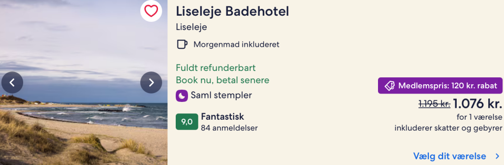 Vi har taget udgangspunkt i et ophold fra den 7. – 8. marts på Liseleje Badehotel, der byder på komfortable værelser, der er elegant indrettet med et klassisk dansk design, som reflekterer hotellets maritime arv. Mange af værelserne har udsigt over stranden eller de omkringliggende grønne områder, og de moderne faciliteter som gratis Wi-Fi, fladskærms-tv og minibar sikrer, at gæsterne får en afslappet og komfortabel oplevelse.
