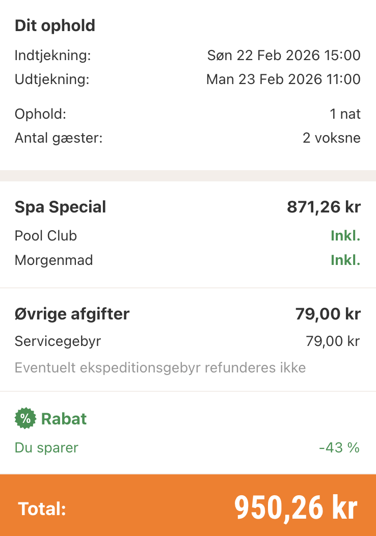 Bemærk: Den samlede pris for opholdet er 950,- for 2 personer i et dobbeltværelse, hvilket svarer til 475,- per person inkl. obligatorisk ekspeditionsgebyr på 79,- Tider til Pool Club tildeles afhængigt af tilgængelighed. Rejs365 er ikke et rejsebureau, men en rejseside, der finder gode tilbud! – Vi modtager kommission, men det påvirker ikke din pris! Læs mere her