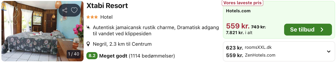 Xtabi Resort er et charmerende resort beliggende på klipperne i West End, Negril, med direkte udsigt over det Caribiske Hav. Resortet er kendt for sin afslappede, autentiske atmosfære og spektakulære solnedgange. Her bor man i enkle, hyggelige værelser og cottages tæt på naturen, med adgang til swimmingpool, restaurant og snorkling direkte fra klipperne. Xtabi er et ideelt valg for rejsende, der ønsker en rolig og ægte jamaicansk oplevelse – tæt på både Seven Mile Beach og Negrils seværdigheder.