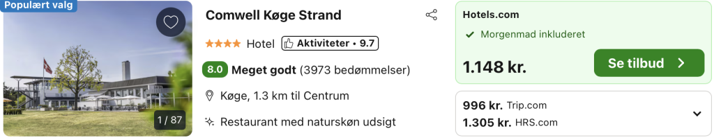 Vi har taget udgangspunkt i et weekendophold fra 28. februar – 1. marts på Comwell Køge Strand, der ligger smukt placeret ved vandkanten i Køge. På hotellet, der er bygget i en moderne og stilren stil, får du en skøn udsigt over Køge Bugt. Hotellet er indrettet med varme detaljer, der skaber en afslappet atmosfære. Det ligger i kort afstand fra Køges charmerende gamle bydel, hvor du kan gå på opdagelse i de hyggelige gader og opleve byens historie.