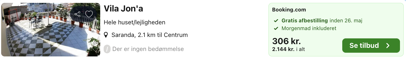Hvis rejsen er med “Vis fly” og “Vis hotel” link, så er der tale om en sammensat rejse. Det vil sige at fly og hotel skal bestilles hver for sig. Prisen vi angiver vil dog være samlet for fly og hotel med mindre andet er angivet.