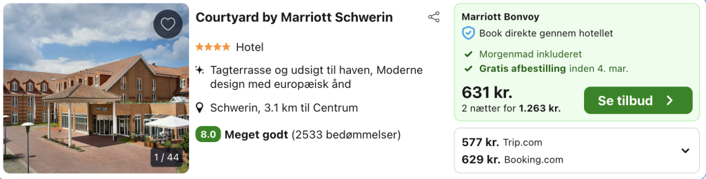 Bemærk: Den samlede pris for opholdet er 1.155,- for 2 personer i et dobbeltværelse, hvilket svarer til 578,- per person. Der kan være mindre prisforskelle på mobil og pc. Undersøg med fordel, hvor det er billigst inden bestilling. Rejs365 er ikke et rejsebureau, men en rejseside, der finder gode tilbud! – Vi modtager kommission, men det påvirker ikke din pris! Læs mere her |