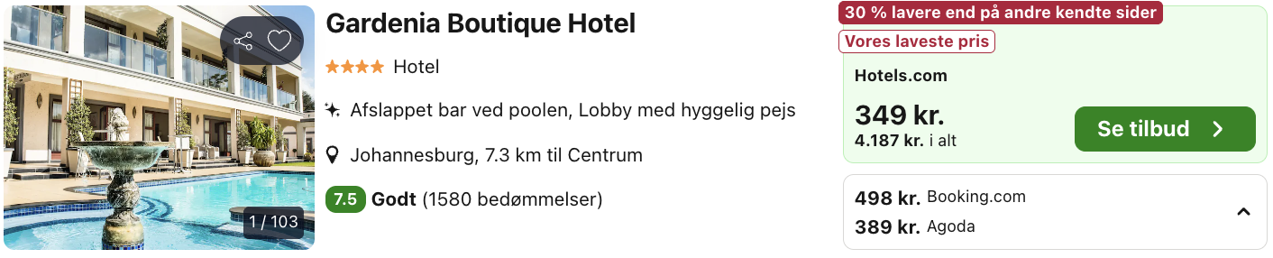 Hvis rejsen er med “Vis fly” og “Vis hotel” link, så er der tale om en sammensat rejse. Det vil sige at fly og hotel skal bestilles hver for sig. Prisen vi angiver vil dog være samlet for fly og hotel med mindre andet er angivet.