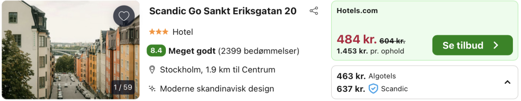 Scandic Go Sankt Eriksgatan 20 ligger centralt i Stockholm i bydelen Kungsholmen, tæt på både Vasastan og byens vigtigste knudepunkter. Hotellet er indrettet i Scandic Go-konceptets moderne og minimalistiske stil med kompakte, funktionelle værelser, hvor fokus er på komfort, gode senge og en effektiv indretning. Stemningen er urban og afslappet, perfekt til storbyrejsende, der ønsker en smart og prisvenlig base midt i byen.