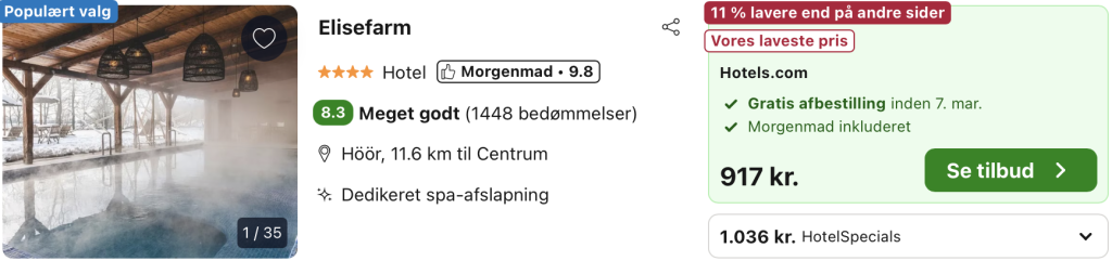 Vi har taget udgangspunkt i et ophold fra den 8. – 9. marts på Elisefarm, der tilbyder et luksuriøst spacenter, hvor gæster kan slappe af og lade sig forkæle. Spafaciliteterne omfatter blandt andet opvarmede pools, saunaer og en udendørs jacuzzi med udsigt over den smukke natur. Der er også mulighed for at bestille forskellige wellness-behandlinger, såsom massage og skønhedsbehandlinger.