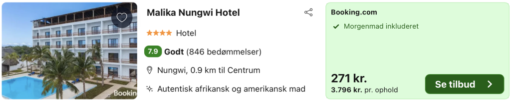 Hotellet byder på pool, restaurant og hyggelige fællesområder, hvor man kan slappe af efter en dag med sol, badning eller snorkling. Beliggenheden i Nungwi gør det nemt at opleve både strandliv, lokale restauranter, små butikker og udflugter som bådture og dykning. Det er et oplagt valg for både par og rejsende, der ønsker en afslappet ferie i tropiske omgivelser.