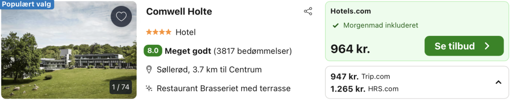 Vi har taget udgangspunkt i et ophold fra 14. – 15. februar på Comwell Holte, der ligger i naturskønne omgivelser nord for København, omgivet af grønne skove og rolige søer. Hotellet kombinerer moderne komfort med en afslappet atmosfære og er kendt for sin smagfulde indretning, hvor naturen spiller en tydelig rolle i både design og stemning. Værelserne er lyse og funktionelle med fokus på komfort og ro, hvilket gør stedet velegnet til både forretningsrejsende, konferencer og weekendophold.