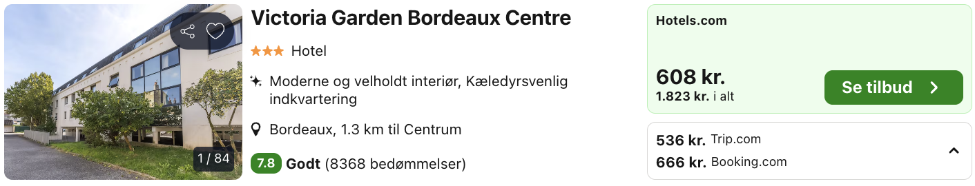 | Bemærk: Den samlede pris for hotellet er 1.607,- for 2 personer i et dobbeltværelse, hvilket svarer til 804,- per person. |