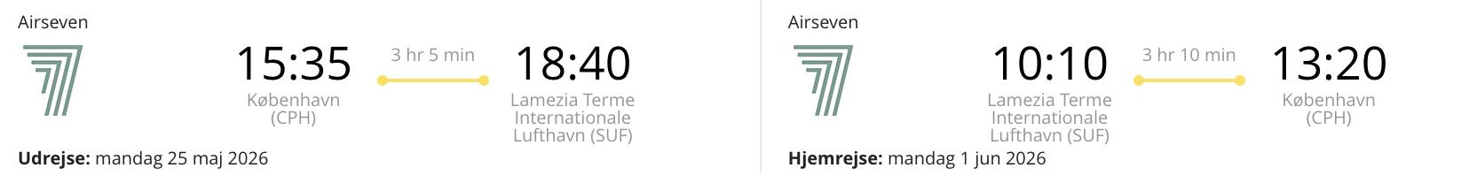 Hvis rejsen er med “Vis fly” og “Vis hotel” link, så er der tale om en sammensat rejse. Det vil sige at fly og hotel skal bestilles hver for sig. Prisen vi angiver vil dog være samlet for fly og hotel med mindre andet er angivet.