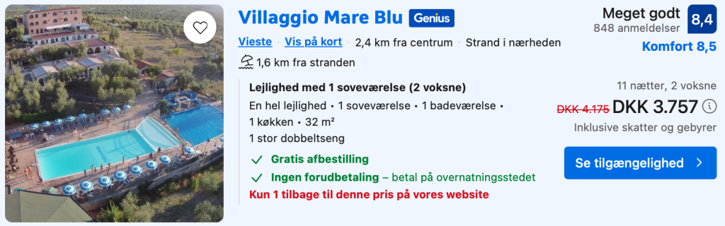 Villaggio Mare Blu ligger naturskønt ved Vieste på Gargano-halvøen i Syditalien, omgivet af grønne omgivelser og med kort køretur til både stranden og byens centrum. Her finder du swimmingpools, sportsfaciliteter og fællesområder, der indbyder til både afslapning og aktiviteter. Villaggio Mare Blu er et godt valg for alle der ønsker en afslappet ferie med strand, natur og syditaliensk stemning.