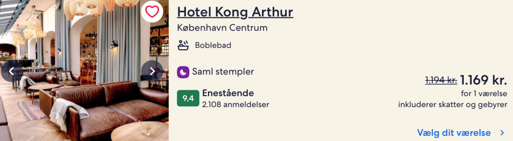 | Bemærk: Prisen for opholdet er 1.169,- for 2 personer i et dobbeltværelse med morgenmad, hvilket svarer til 585,- per person.