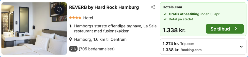REVERB by Hard Rock Hamburg er et hotel, du ikke glemmer. Her bor du midt i Hamborg – oven på en historisk bunker, der i dag er forvandlet til et moderne designhotel med udsigt over hele byen. Kombinationen af rå beton og blød komfort giver stedet en helt særlig stemning, hvor musik, kreativitet og bæredygtighed går hånd i hånd.