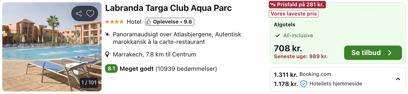 Hvis rejsen er med “Vis fly” og “Vis hotel” link, så er der tale om en sammensat rejse. Det vil sige at fly og hotel skal bestilles hver for sig. Prisen vi angiver vil dog være samlet for fly og hotel med mindre andet er angivet.