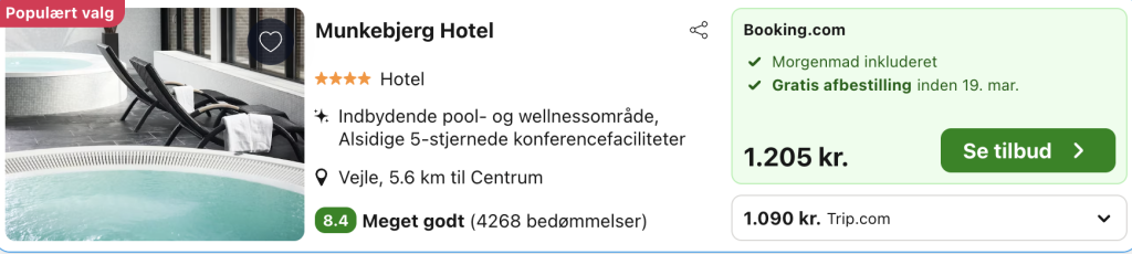Munkebjerg Hotel er en elegant perle beliggende midt i naturskønne omgivelser ved Vejle Fjord. Hotellet er kendt for sin unikke placering omgivet af skov og med udsigt over vandet, hvilket gør det til en ideel destination for dem, der søger afslapning, forkælelse og smukke omgivelser.