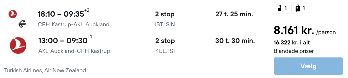 Udrejse fra København er den 24. marts, mens ankomst i Auckland er den 26. marts. |