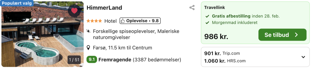 Bemærk: Der kan være mindre prisforskelle på mobil og pc. Undersøg med fordel, hvor det er billigst før bestilling. Prisen for opholdet er 901,- for 2 personer i et dobbeltværelse, hvilket svarer til 451,- per person. Entré til HimmerLand Spa købes direkte hos hotellet og koster 445,- per person. Vi har inkluderet adgang til spa i vores pris. Rejs365 er ikke et rejsebureau, men en rejseside, der finder gode tilbud! – Vi modtager kommission, men det påvirker ikke din pris! Læs mere her |