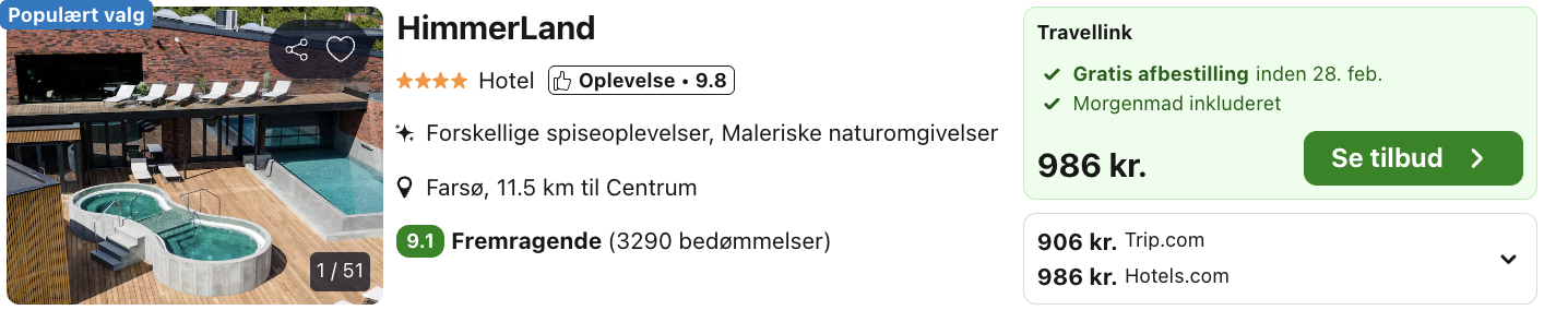 Bemærk: Der kan være mindre prisforskelle på mobil og pc. Undersøg med fordel, hvor det er billigst før bestilling. Prisen for opholdet er 906,- for 2 personer i et dobbeltværelse, hvilket svarer til 453,- per person. Entré til HimmerLand Spa købes direkte hos hotellet og koster 445,- per person. Vi har inkluderet adgang til spa i vores pris. Rejs365 er ikke et rejsebureau, men en rejseside, der finder gode tilbud! – Vi modtager kommission, men det påvirker ikke din pris! Læs mere her |