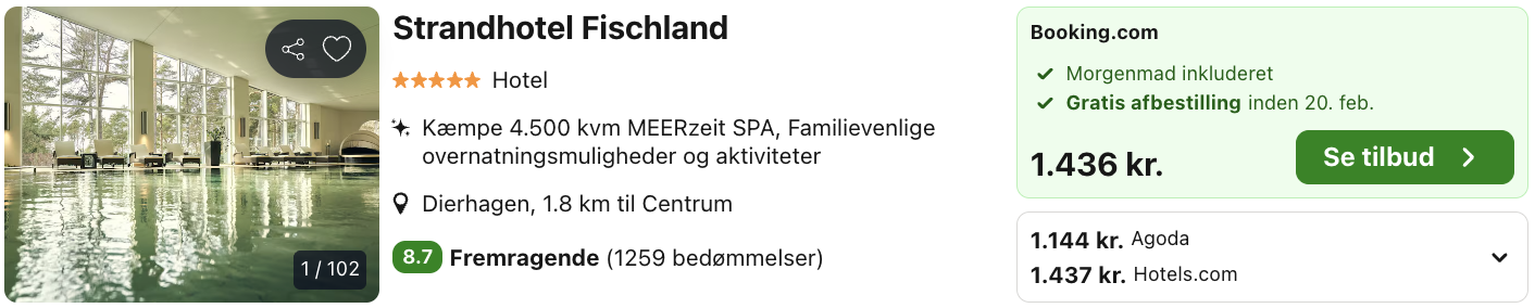 Vi har taget udgangspunkt i et ophold fra den 7. – 8. marts på Strandhotel Fischland, der er et smukt 5-stjernet strandhotel, der ligger direkte ved Østersøen, omgivet af brede strande, duftende fyrreskov og bølgende klitter. Værelser og suiter er lyse, rummelige og indrettet i en afslappet nordisk stil, mange med egen balkon, hvorfra man kan nyde udsigten over havet eller den omkringliggende natur.