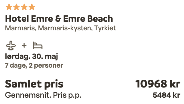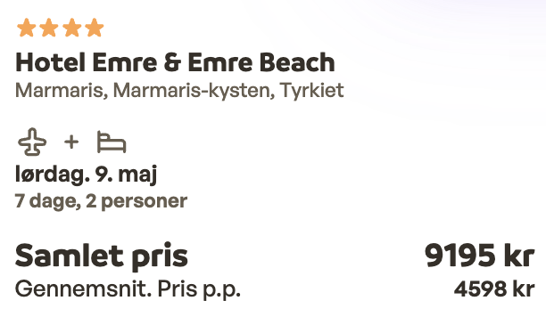 Hvis rejsen er med “Vis rejse” link, så er der tale om en pakkerejse, hvor fly og hotel bestilles på en gang.