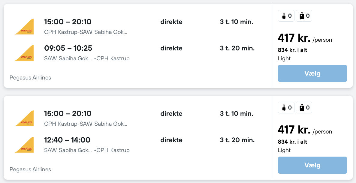 Flyprisen inkluderer kun en lille taske, men bagage kan tilkøbes.