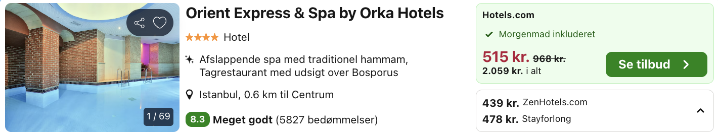 | Bemærk: Husk at lade søgningen på fly og hotel blive helt færdig. Der kan være mindre prisforskelle på mobil og pc. Vælg “Vores laveste pris” på trivago, for at opnå den bedste pris på hotellet.