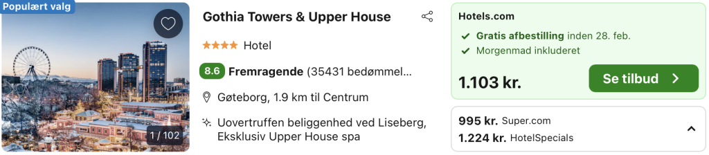Vi har taget udgangspunkt i et ophold fra den 1. – 2. marts på Gothia Towers & Upper House, der er ikoniske vartegn i Göteborg, der tilsammen udgør en enestående oplevelse for besøgende. Upper House er en eksklusiv del af Gothia Towers, der tilbyder enestående luksus og en særlig følelse af forkælelse. Hotellet ligger på de øverste etager og byder på imponerende udsigt over byen. Med store, elegante værelser og en prisbelønnet spa med en spektakulær udendørs glasbundspool hævet over byen, er det et sted, hvor afslapning når nye højder.