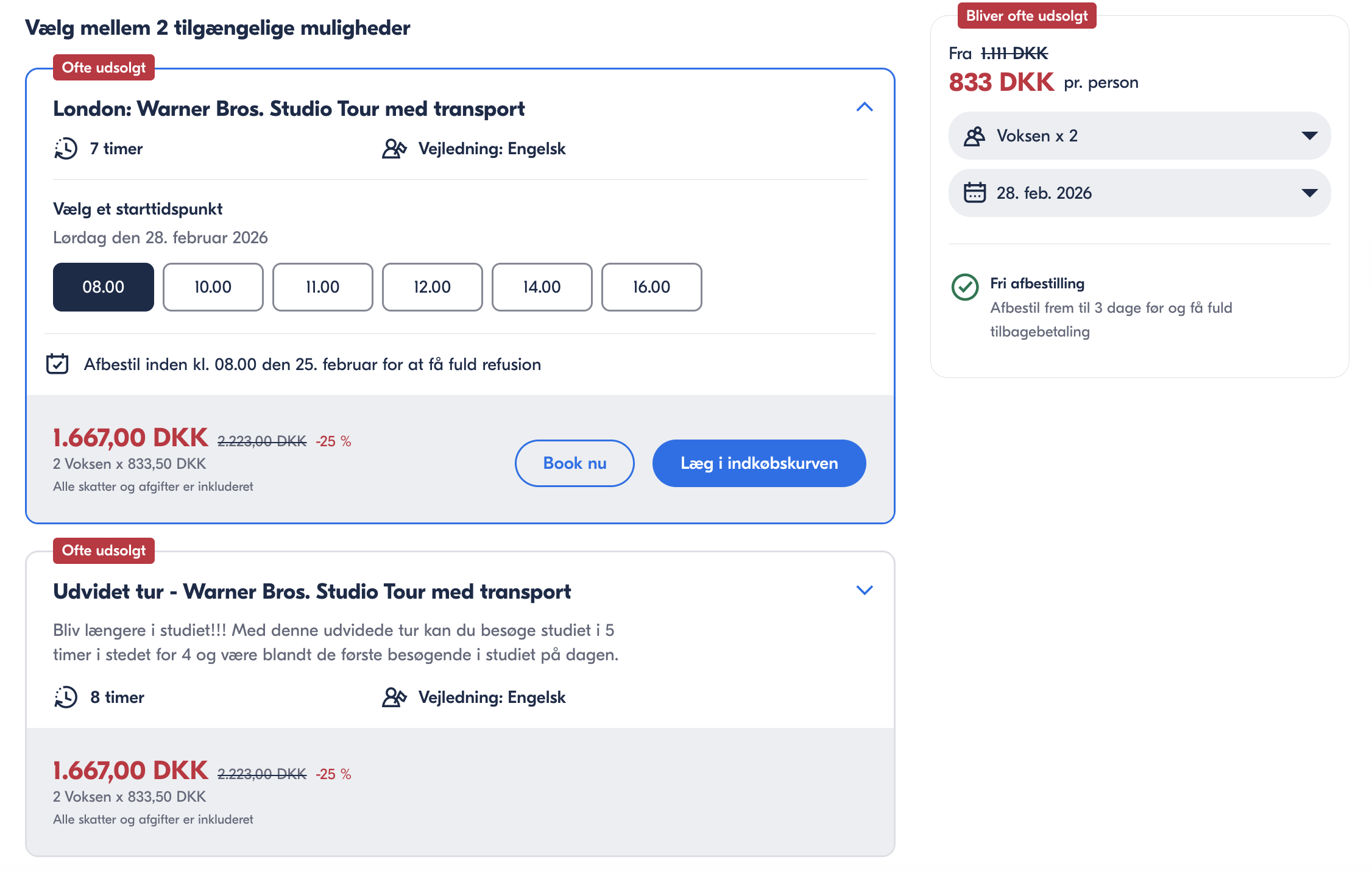 På Getyourguide kan du nemt og billigt bestille 1-dags ture fra London til Harry Potter Warner Brothers Studio. Bemærk at der er flere ture at vælge imellem samt andre datoer at vælge imellem.