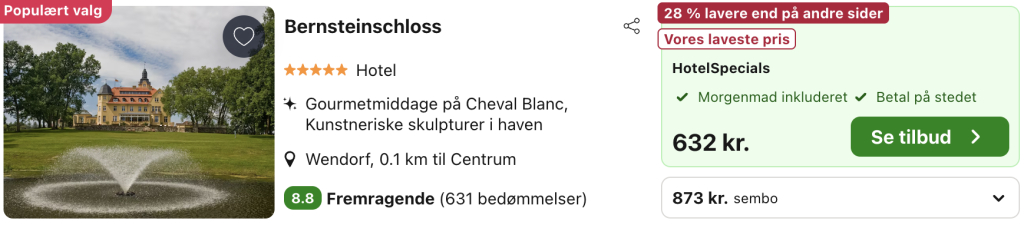 Bemærk: Den samlede pris for 2 personer i et dobbeltværelse er 632,- hvilket svarer til 316,- per person. Der kan være mindre prisforskelle på mobil og pc. Undersøg med fordel, hvor det er billigst inden bestilling.