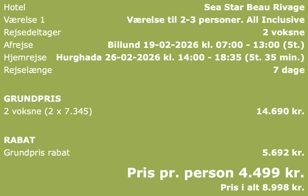 Prisen tager udgangspunkt i 2 personer. Man kan sagtens rejse flere voksne og eller med børn og derved typisk opnå en billigere pris pr. person.