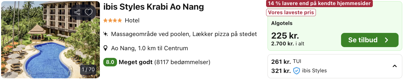 | Bemærk: Hotellet koster 2.700,- for to personer i et dobbeltværelse, hvilket svarer til 1.350,- per person. Husk at vælge den billigste pris.