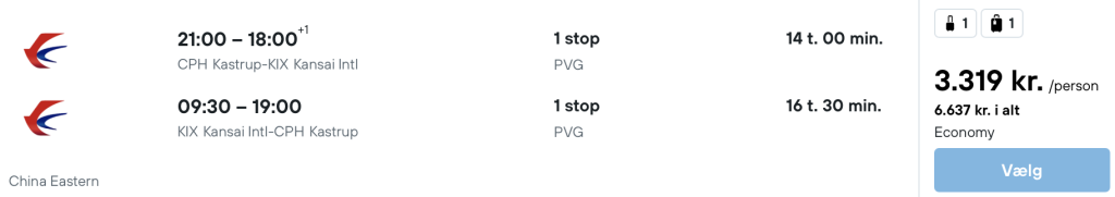 På vores flysøgningsmaskine har vi fundet billige flybilletter fra København til Osaka: