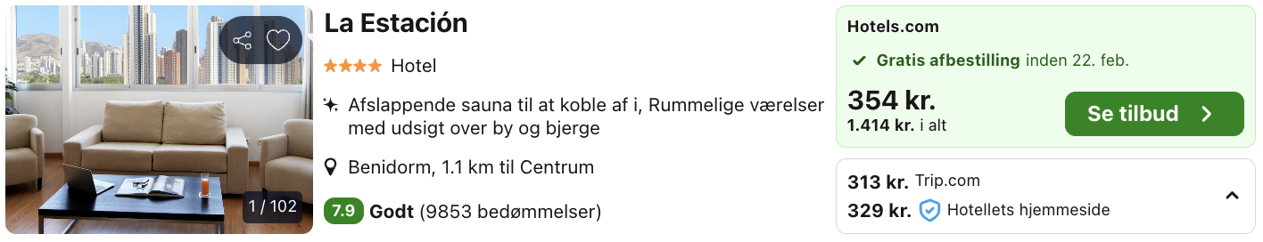Hvis rejsen er med “Vis fly” og “Vis hotel” link, så er der tale om en sammensat rejse. Det vil sige at fly og hotel skal bestilles hver for sig. Prisen vi angiver vil dog være samlet for fly og hotel med mindre andet er angivet.