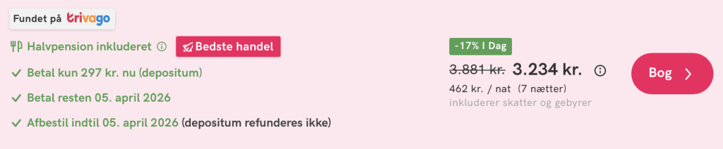 Hvis rejsen er med “Vis rejse” link, så er der tale om en pakkerejse, hvor fly og hotel bestilles på en gang.